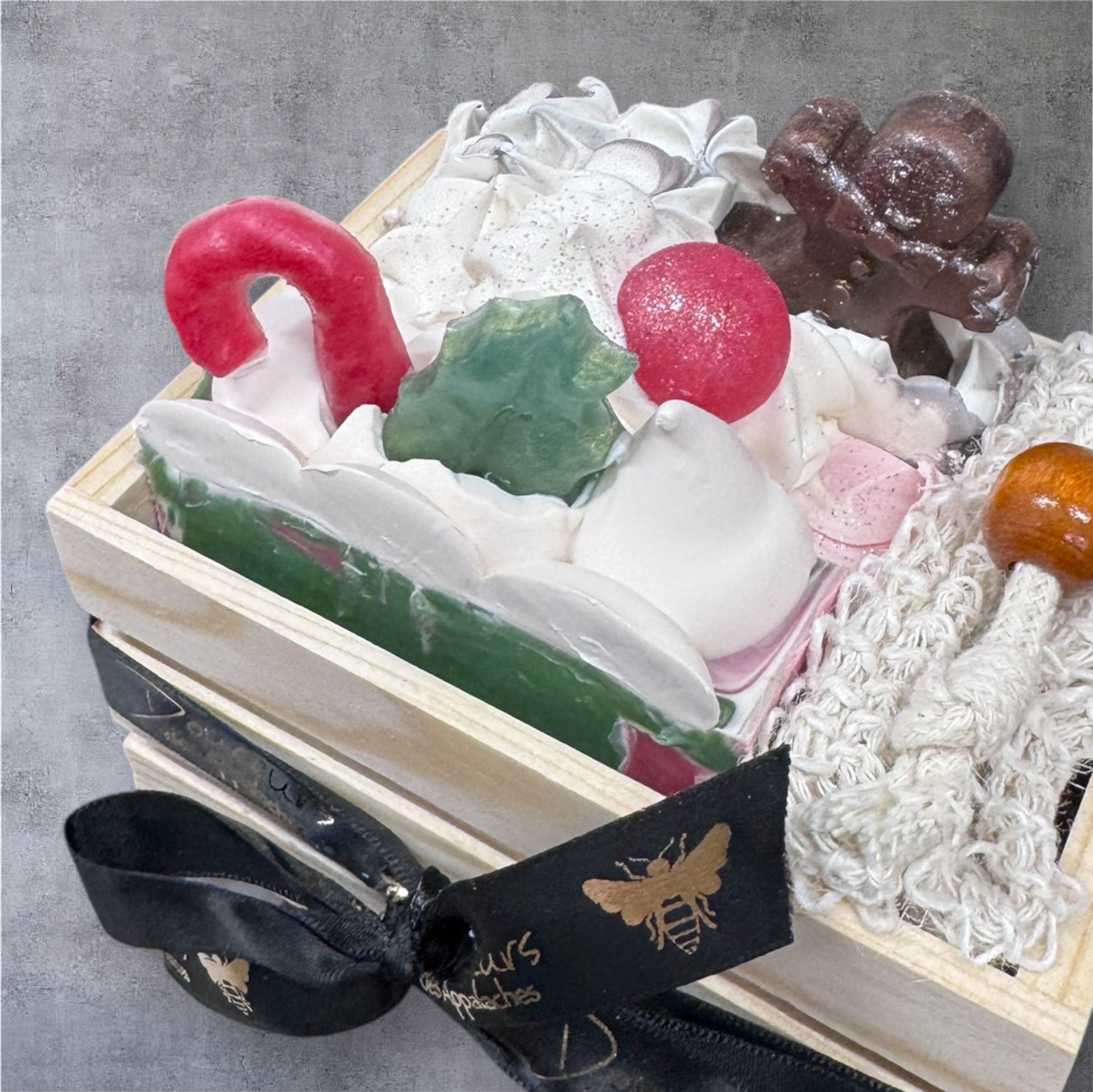 Boîte-cadeau en bois contenant 3 savons de Noël (Nez Rouge, Féérie des Neiges et Pain d'épices) et un sac exfoliant pour savons en coton et lin.