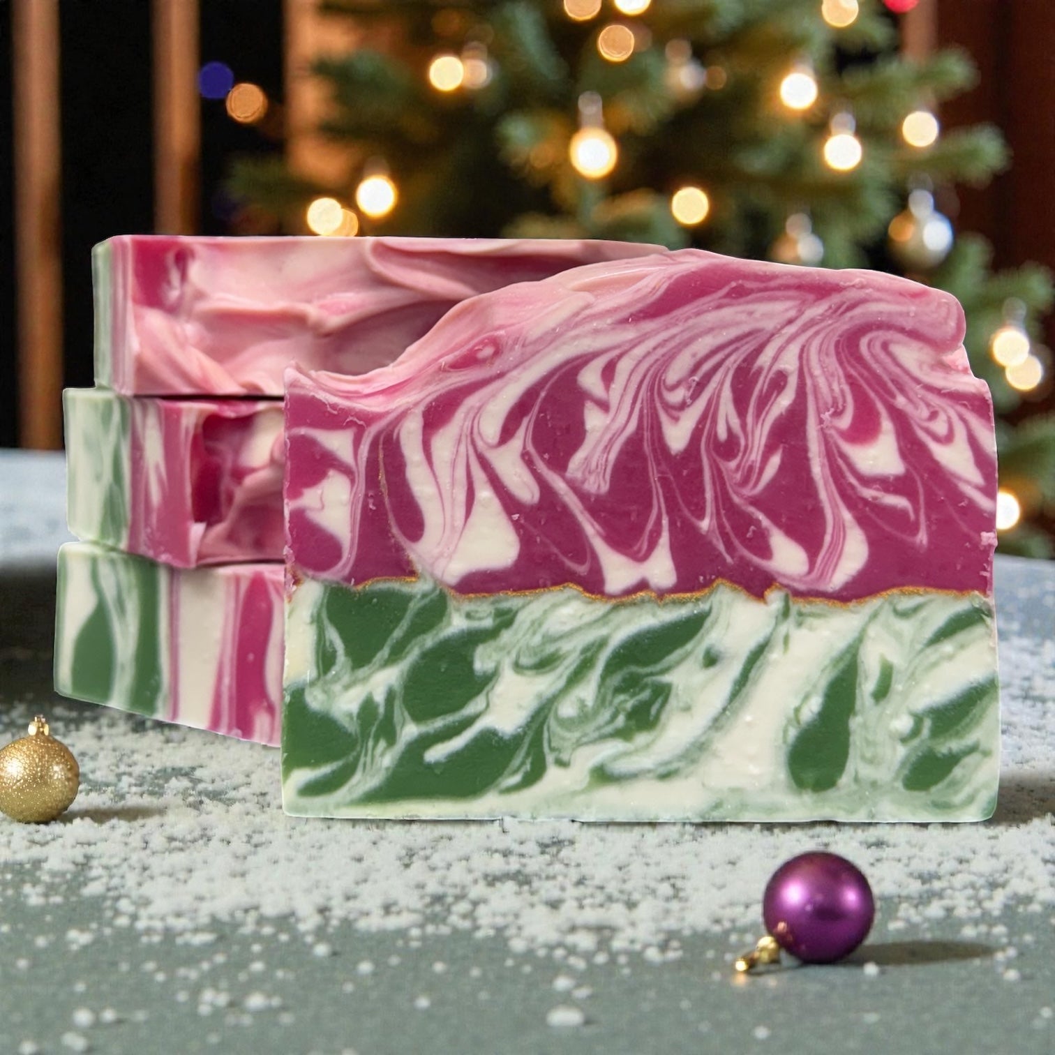 Savon artisanal doux du temps des Fêtes enrichi de beurre de karité (10%), ÉPINETTES GIVRÉES est délicieusement parfumé d'huiles aromatiques certifiées sans phtalates aux effluves de sapin.