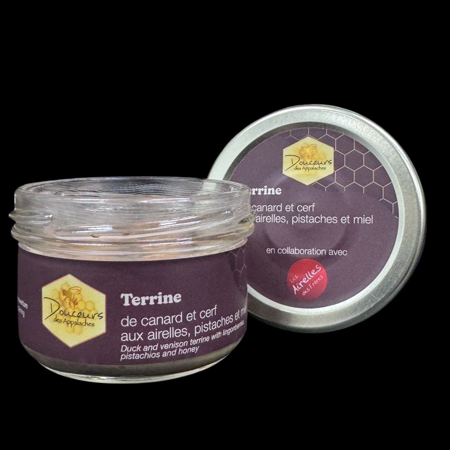 Ingrédients : Canard, Pommes de terre, Cerf, Gras de canard, Eau, Oignons, Airelles rouges séchées, Pistaches, Œufs, Miel biologique, Fécule de maïs, Sel, Gélatine, Poivre rose.